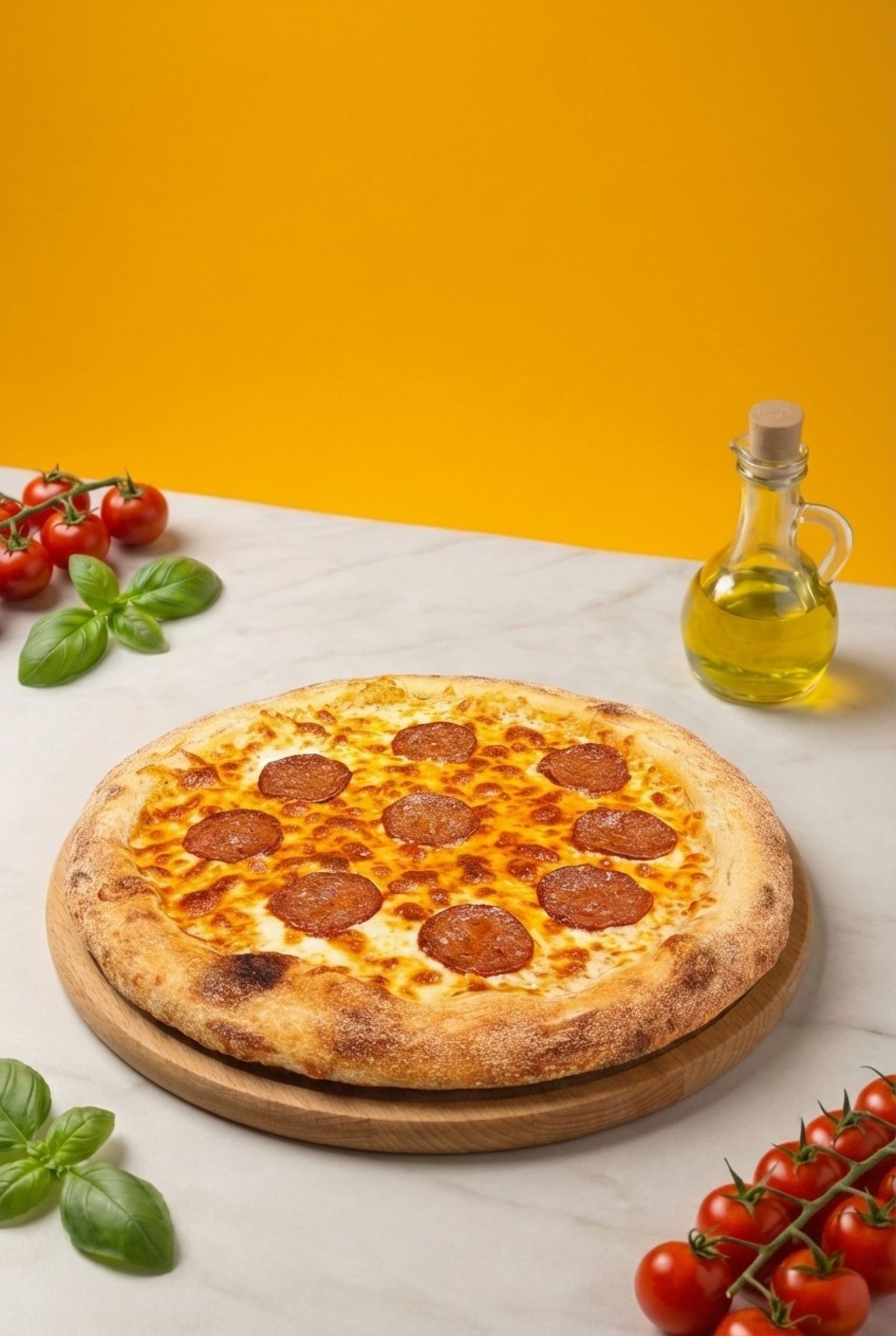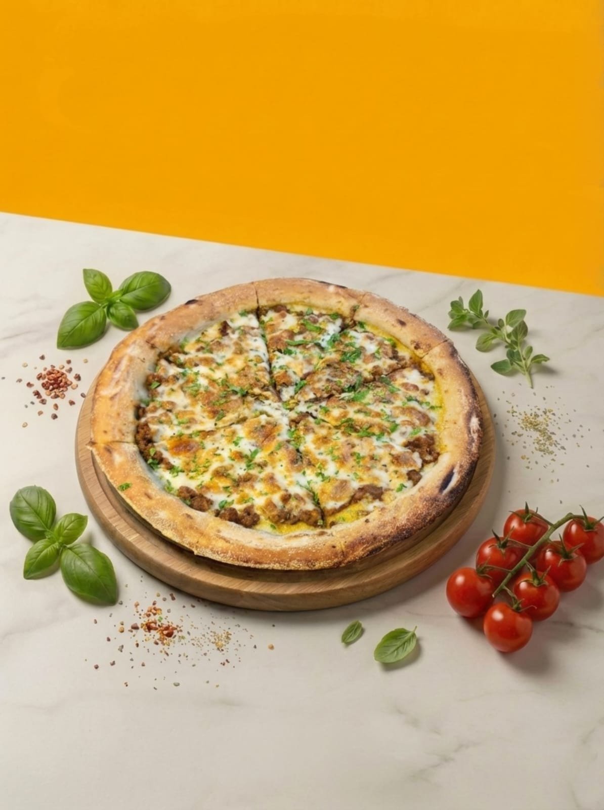 Pizza with Italian mix herbs sauce, mozzarella cheese, pepperoni, Italian fresh herbs and forno sauce.