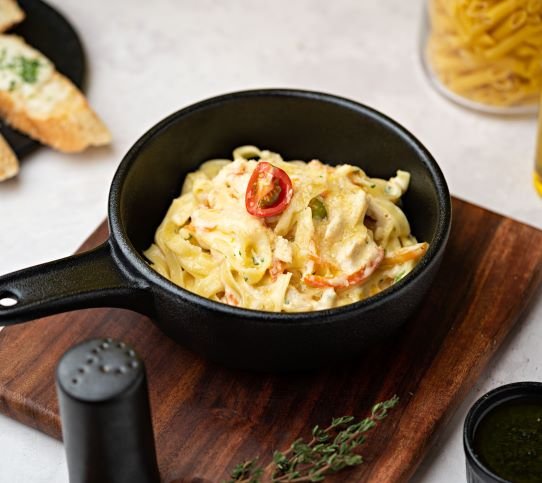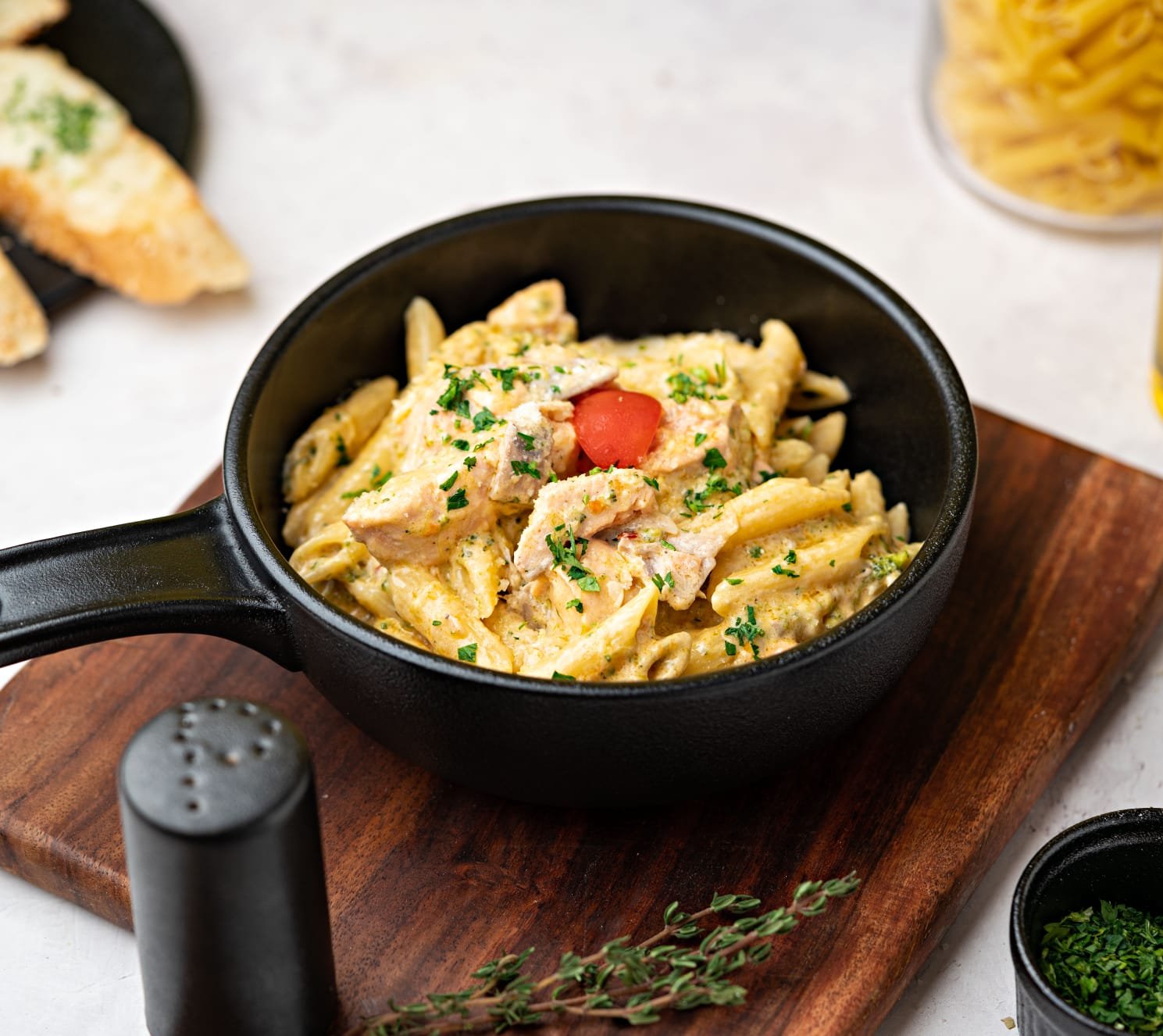 Chicken pieces, fusilli pasta, mixed vegetable, cooking cream, tomato sauce and parmesan cheese