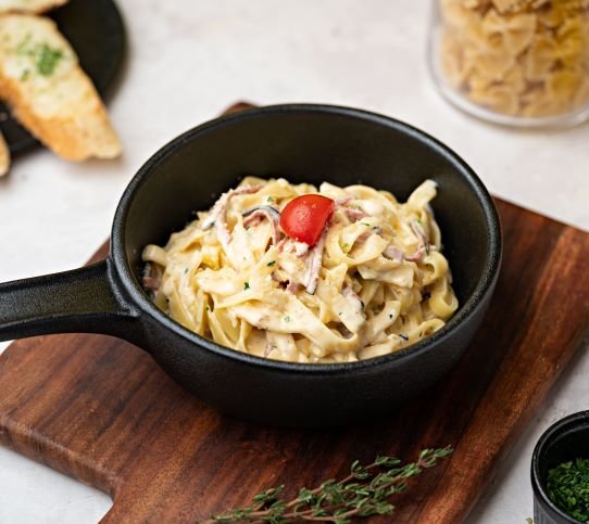 Fettuccine pasta, smoked beef, cooking cream and parmesan cheese.