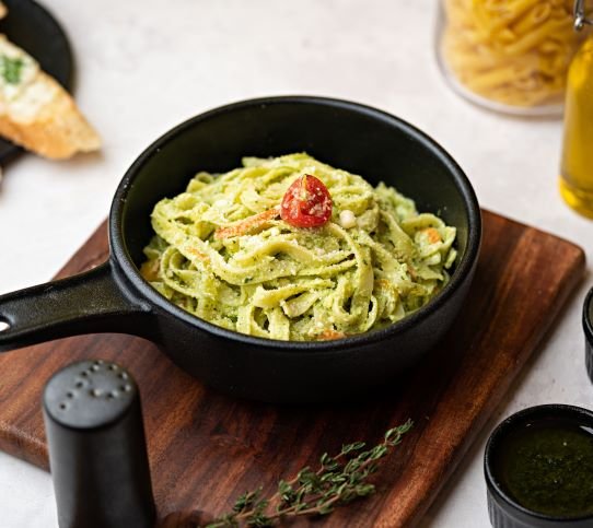 Homemade basil pesto, mixed veggies, cooking cream and parmesan cheese.