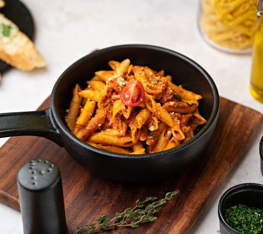 penne pasta, porcine sauce, parmesan cheese and chicken
