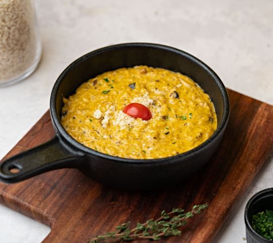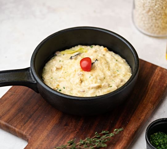 Italian risotto, porcini, mushrooms, cooking cream, cherry tomatoes and parmesan cheese.