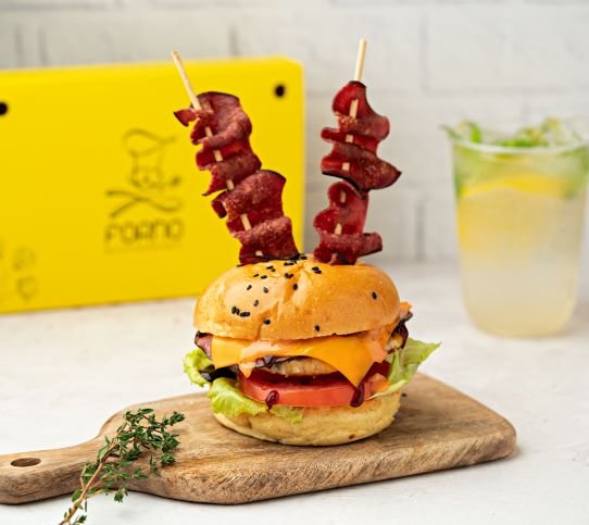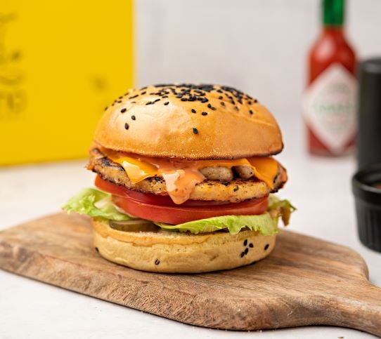 Fresh chicken patty, smoked turkey slices, lettuce, tomato, pickles, BBQ sauce and chef sauce.