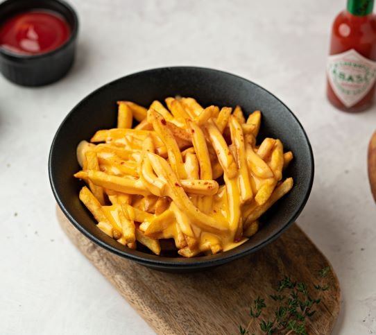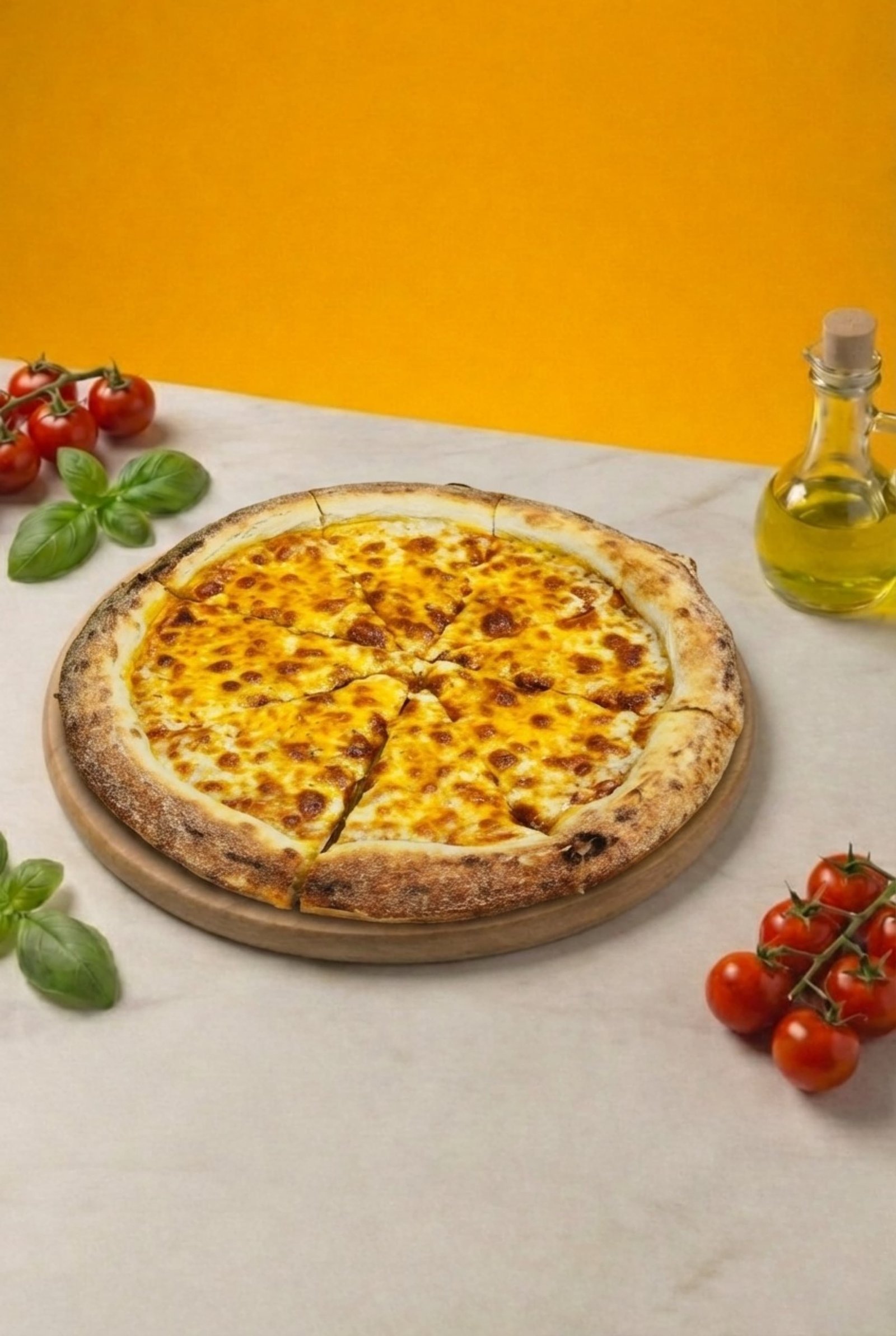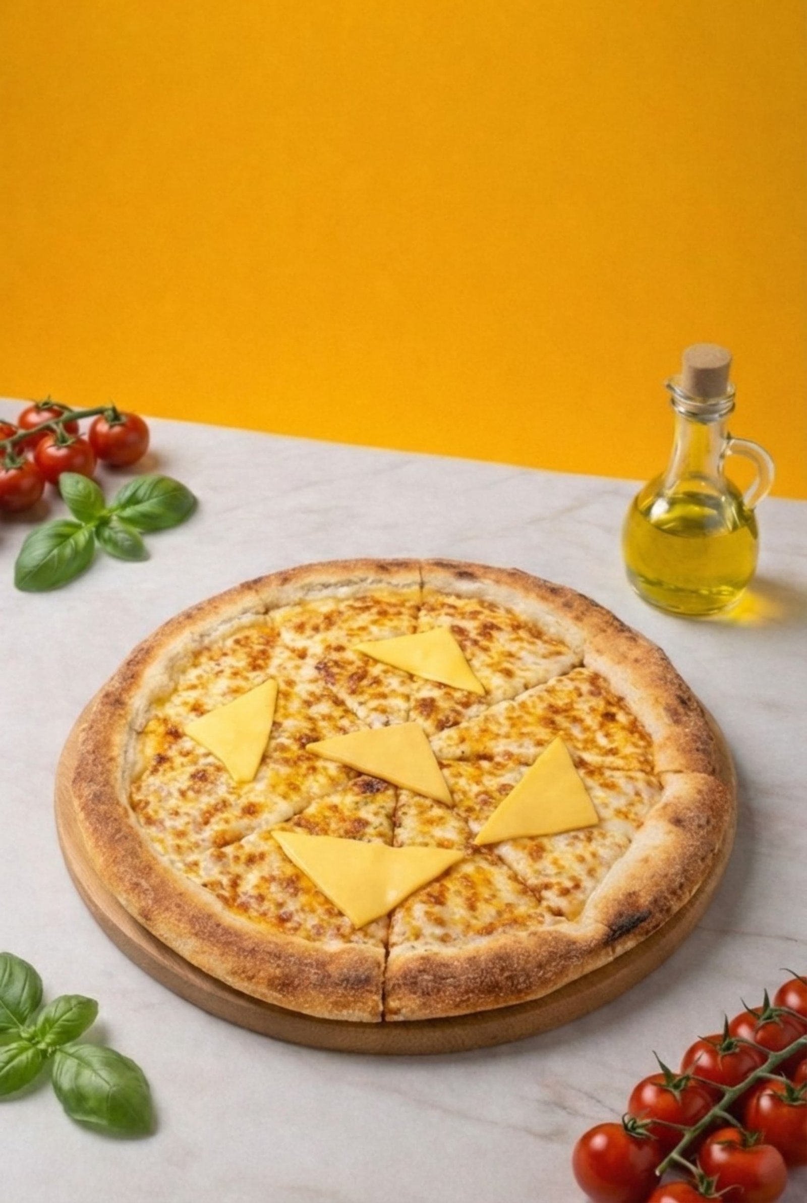 Mozzarella cheese, cheddar cheese, kashkaval cheese, parmesan cheese and forno sauce.