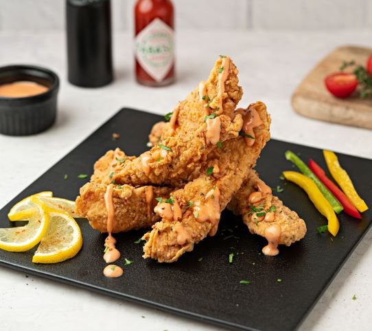 Crispy fried chicken, sliced tomato, cucumber, pickle, cheddar cheese.