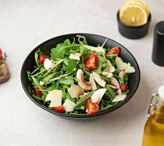 rocca, mushrooms, cherry tomatoes, Parmesan cheese and balsamic glaze