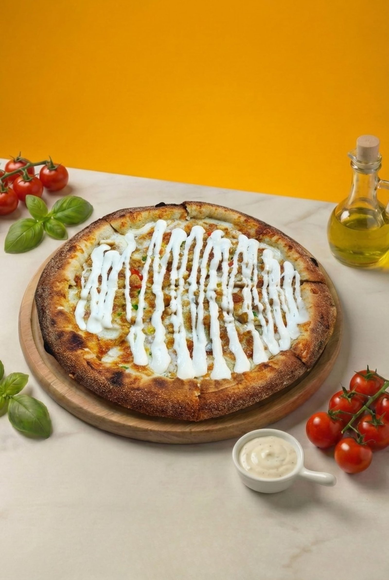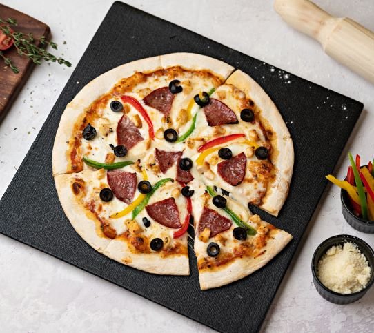 Pepperoni, chicken, black olives, mixed colored capsicum, sliced onions, italian fresh herbs, mozzarella cheese and forno sauce.