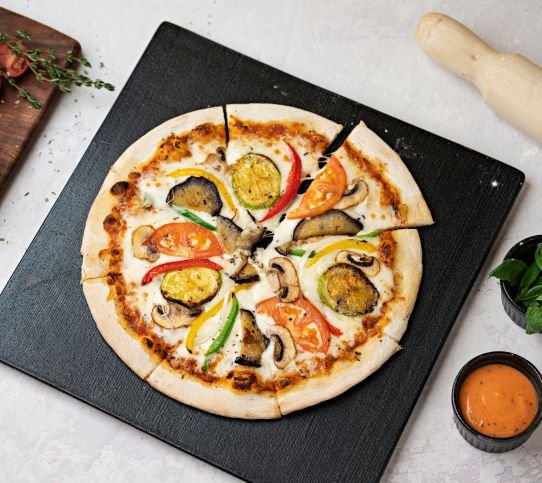 Eggplant, sliced zucchini, sliced onions, sliced tomatoes, black olives, mushroom, mixed capsicum, mozzarella cheese, Italian herbs, Italian mix herb sauce and FORNO sauce.